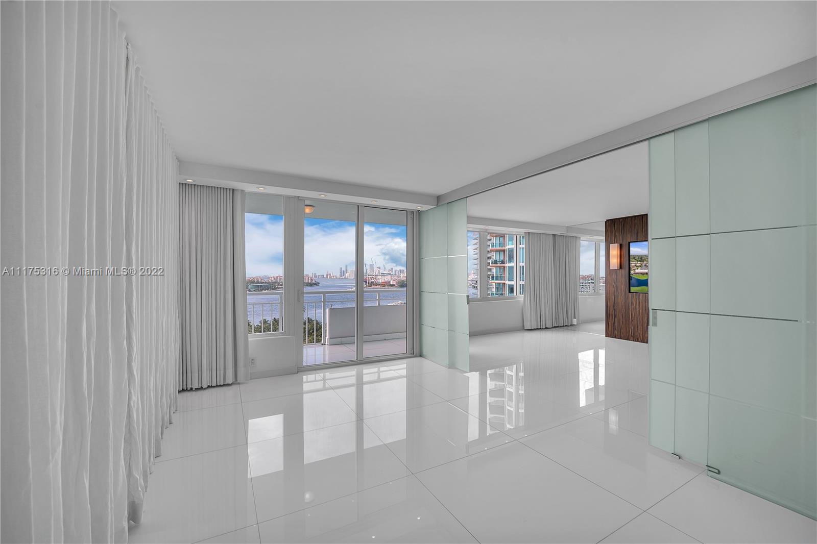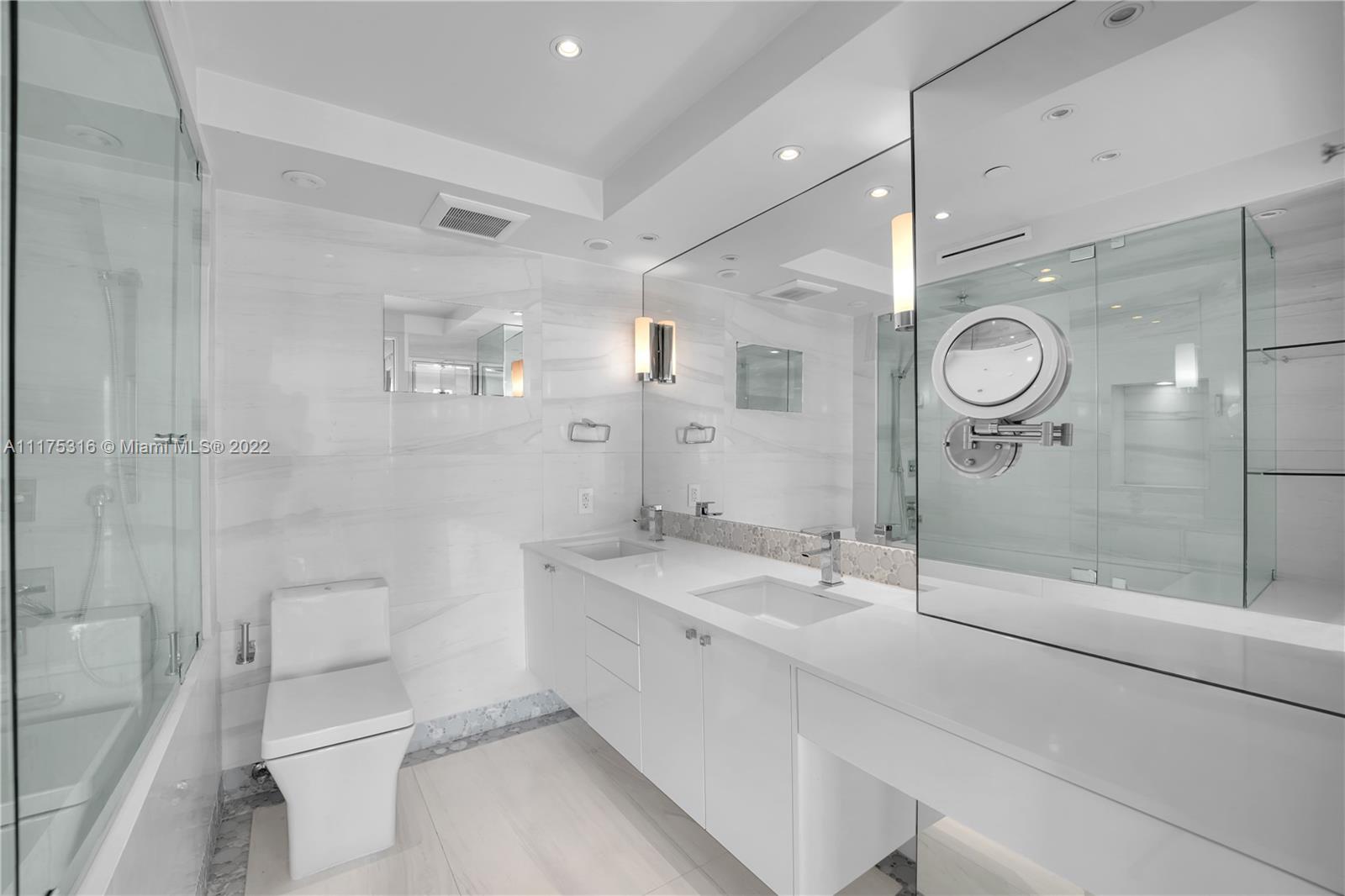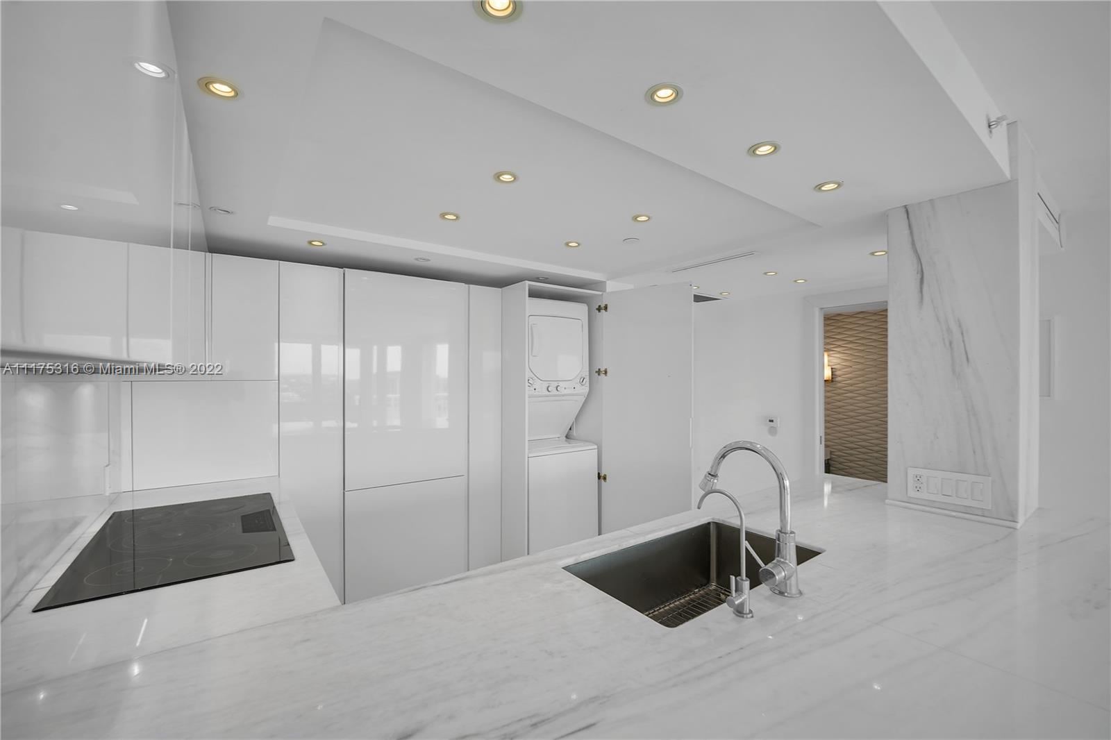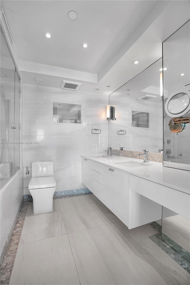 South Pointe Tower's BEST 1 bedroom! Unfurnished. Renovated 1 Bedroom, 1.5 Baths unit with direct views of Govt Cut, Fisher Island and Downtown Miami. Mia Cucina kitchen, Thermador appliances, Carrera counter tops, 40" X 40" White Glass marble floors and Porcelanosa bathrooms. Impact windows with electric shades and blackout drapes. Custom cabinetry and TONS of closet space. Wall has been removed and replaced with glass panels to create open living area. 2 assigned parking spots. Building is in the final stages of the renovation of pool deck, tennis courts and gym. NO PETS. Easy to show.